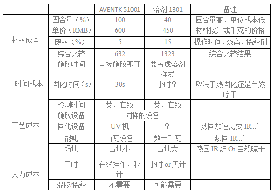 AVENTK團隊對科勒使用的AVENTK 51001 UV膠水與溶劑膠水1301進(jìn)行比較分析,結果顯示AVENTK UV膠水在各項成本上都優(yōu)于溶劑膠水,具有良好的市場(chǎng)前景。
