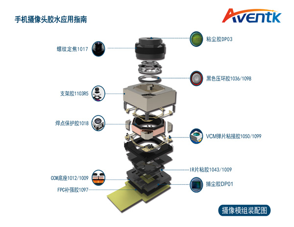 在攝像模組用膠方面,AVENTK有著(zhù)一系列成熟產(chǎn)品,用膠點(diǎn)覆蓋鏡頭粘接、調焦固定、支架粘接、焊點(diǎn)保護、VCM彈片粘接、CCM底座、FPC補強、IR片粘接等,膠水類(lèi)型包括UV膠水、熱固化膠水等。在攝像模組用膠方面,AVENTK潛心鉆研,針對攝像模組各用膠點(diǎn)以及各種新問(wèn)題新需求,研發(fā)生產(chǎn)適用的攝像模組UV膠,并且長(cháng)期與國內一線(xiàn)攝像模組廠(chǎng)家保持合作。