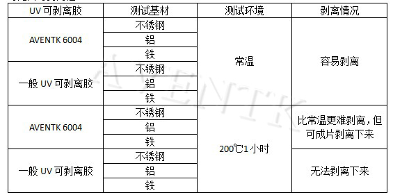 AVENTK 6004相比一般UV可剝離膠,具有優(yōu)秀的耐高溫能力,經(jīng)實(shí)驗測試,AVENTK 6004 光固化后經(jīng)過(guò)高溫工藝,在金屬基材上依然具有出色的可剝離性。