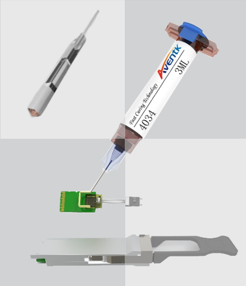 在進(jìn)行光器件封裝時(shí),通常要求膠水通過(guò)UV和加熱固化后,低收縮,與光器件保持一致膨脹系數,不產(chǎn)生應力,精密固定,低鹵素,固化后耐雙85測試,耐水煮等。以前這個(gè)應用點(diǎn)大量使用3410,但是隨著(zhù)客戶(hù)國產(chǎn)化需求提高,AVENTK所生產(chǎn)的4034W系列UV熱固膠開(kāi)始逐漸被客戶(hù)使用和普及。